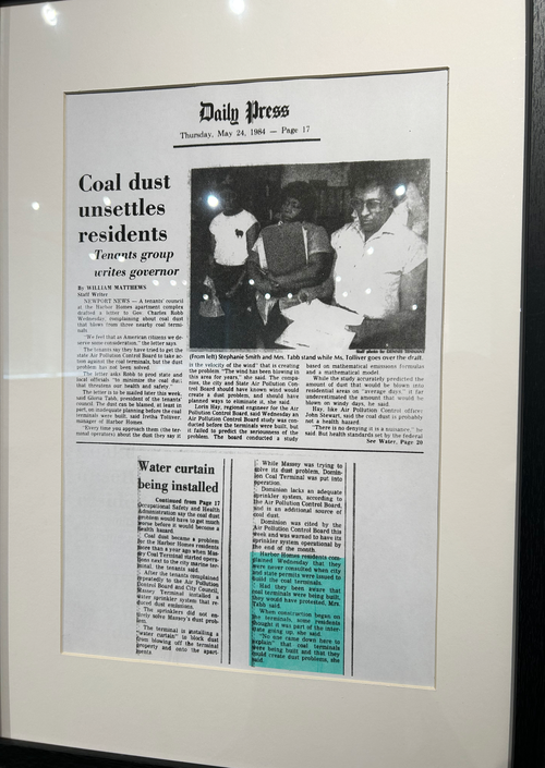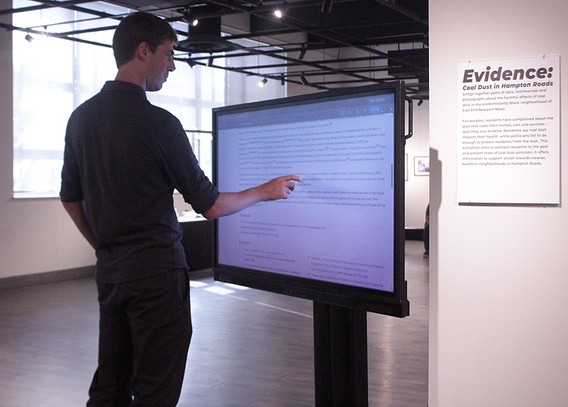 Evidence: Coal Dust in Hampton Roads is a multimedia exhibition that focuses on coal dust pollution that has plagued residents of Southeast Newport News, Virginia, for decades. It was installed June-July 2025 at Downing-Gross Cultural Arts Center in Newport News, VA.